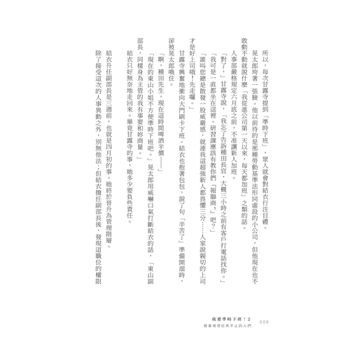 「現在的東山小姐不方便準時下班吧。」晃太郎用威嚇口氣打斷結衣的話,「東山副部長,同樣身為主管的我有事要和妳商量。」