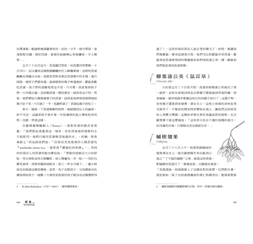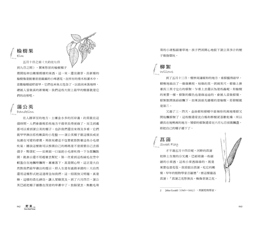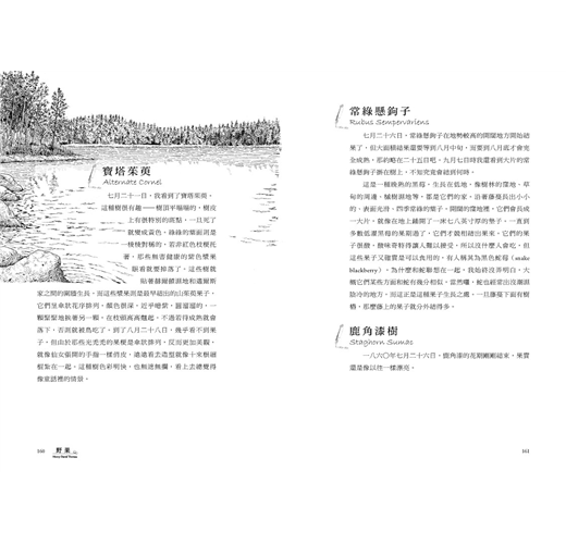 這本書從一年的五月雪融開春為始,到十一月寒冷冰凍來臨前,共收錄183種北美野果,從花期、結果日、成熟期,地理分布、姿態樣貌,及至各類昆蟲、魚鳥與植物間的自然關係,更重要的,還有那果實滋味,他都娓娓道來。