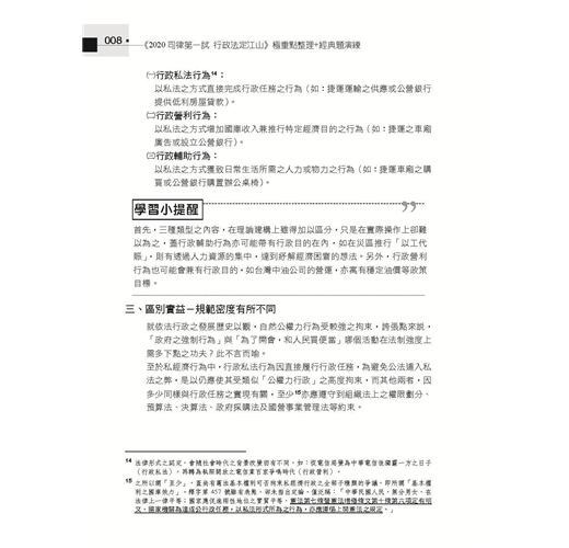 透過實務大聲說、學習小提醒、深度學習、問題意識及歷屆試題解析等小單元,快速連結,掌握重點,清楚剖析行政法,概念不再那麼抽象及破碎,給你一試最需要的邏輯思維,讓測驗題也可以拿高分。