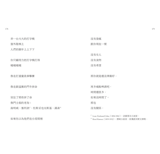 「沒有試圖讓自己看起來不錯,更不用說英勇,布考斯基的寫作具有無所畏懼的真實性,這使得他與絕大多數『自傳體』小說家和詩人有所不同。他牢牢扎根於美國標新立異的傳統,身處鬆散紛亂的社會邊緣,布考斯基寫得當之無愧。」——《舊金山書評》,作家、翻譯家/史蒂芬・凱斯勒(Stephen Kessler)