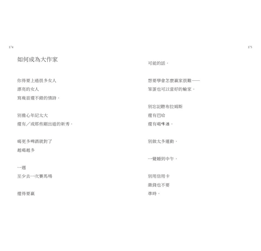 「欣賞布考斯基的詩,最好的方式不是將其作為個人的口頭文物,而是作為他持續進行中的真實冒險故事,像漫畫或者系列電影,具有強烈的敘事性,畫面來自源源不絕的奇聞軼事,裡頭通常包含一間酒吧,一棟廉價旅館,一場賽馬,一個女朋友,或者任何這些元素的排列組合。布考斯基的自由詩是一系列將陳述句拆解成窄短句子的長篇,帶來快速和簡練的印象,即使語言中甚至充滿了多愁善感或是陳腔濫調。」——美國詩人、文學評論家/亞當・柯什(Adam Kirsch)