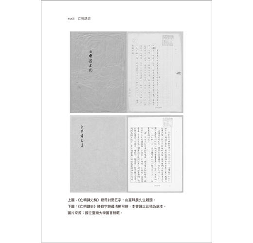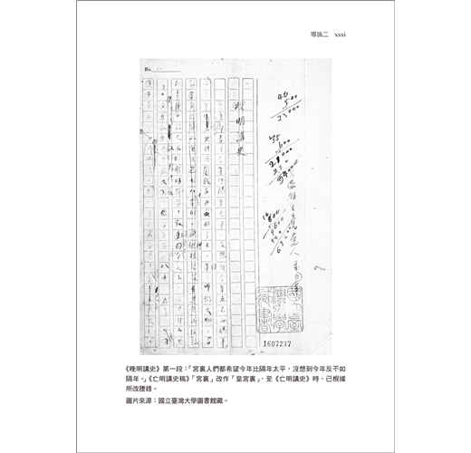一、《亡明講史》一書似乎一度亦曾作《晚明講史》。考《亡明講史》之名,目前現存的資料來看,六冊稿本封面作《亡明講史稿》,內文稿紙上作《明亡講史》。封面有可能是後加,如果不是筆誤,《晚明講史》、《亡明講史》、《明末亡國史》的名稱或許都曾在作者考量之列,因此,《亡明講史》此一書名當是作者細加推敲之後的結果。
