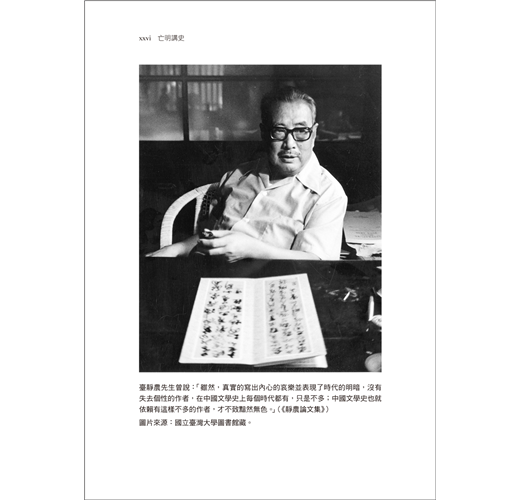 從滿清建立開始,「明末清初」就一直不斷在知識社群記憶中重述、改寫、翻修,不但是史家恆久的關心所在,同樣也提供了眾多文學藝術創作的源泉,更是各方政治勢力主張交鋒動員的話語系統,從民族革命、階級革命、乃至於帝國主義戰爭,不論是文化、宗教、性別種種場域,不論是對外或對內。「明末清初」此一時代話語仍然保持鮮活的能量,臺靜農《亡明講史》一書可以說是他對此一時代圖像的具象化,本書透露出略嫌哀傷無奈的情調,從某個角度來看,也不妨說是一部亂世憂患之書。(封面「亡明講史」四字,取自本書底本,為臺靜農先生親題)