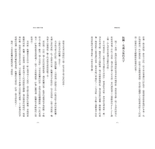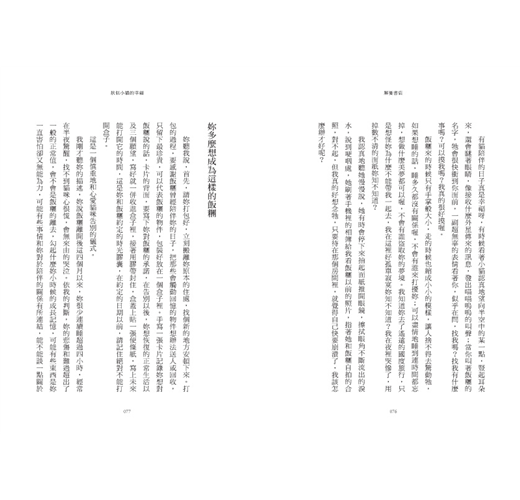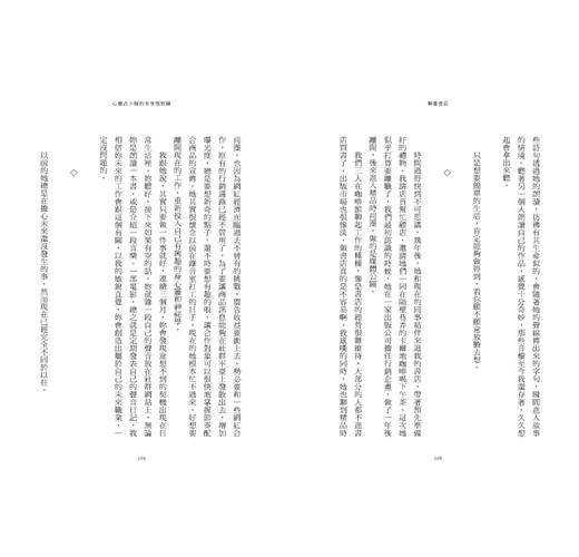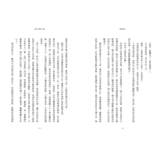 孩子年紀小,她只能說繪本裡的故事給他聽,自己的心事不曉得能說給誰聽,她的憂鬱與畏懼,她的徬徨不安,她找不到孩子以外的生活重心,有些事回不去了,她彷彿提著行李,不知道下一站在哪裡,而候車室牆上的大鐘滴答滴答地提醒她催促她,動作要快,妳已經三十歲了,不能再這樣蹉跎下去。對於一個失婚的女子,不管是感情生活或是經濟上的自主,都是負債,像失去重心的陀螺,離開了安穩的舒適圈,把自己弄得暈頭轉向,人生卻搖搖欲墜,而此刻的她走進了一家書店。