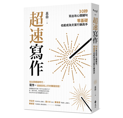 如果有興趣學習寫作技巧,歡迎來上我的課或跟我一起討論。如果希望可以有一本寫作的參考書,我也很樂意推薦呂白的這本新書《超速寫作》。就讓我們一起努力,成為這個時代不可或缺的文案行銷高手吧!
