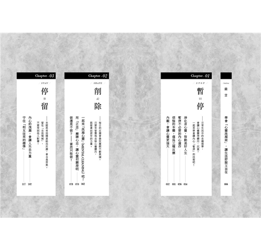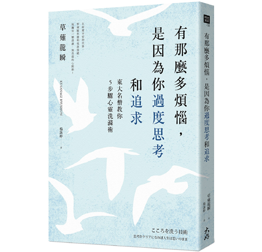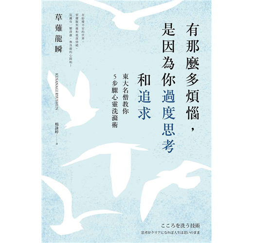 我們之所以有那麼煩惱,也許是一時的心靈蒙蔽,或沉溺在自憐中,抑或是拒絕面對真相和苦痛。草薙龍瞬提倡「心靈洗滌術」,整理成五個關鍵字:暫停、削除、停留、重建、超越,象徵著五種心境與階段。他告訴我們,只要暫停不必要的內心小劇場,削除多餘的雜念,專注於自我的內在安定,就能重建堅定心志,超越現實難題,進而擁有幸福的生活。
