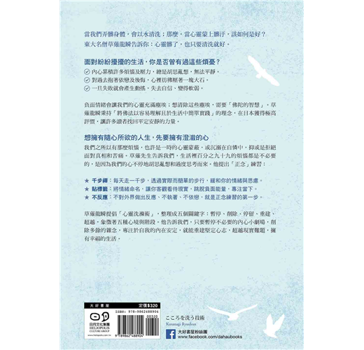 當我們弄髒身體,會知道以水清洗;那麼,當心靈蒙上髒汙,該如何是好?東大名僧草薙龍瞬告訴你:心靈髒了,也只要清洗就好。負面情緒會讓我們的心靈充滿塵埃;想要清除這些塵埃,需要的是「佛陀的智慧」。草薙先生秉持「將佛法以容易理解且於生活中簡單實踐」的理念,在日本獲得極高評價,讓許多讀者找回平靜安定的力量。