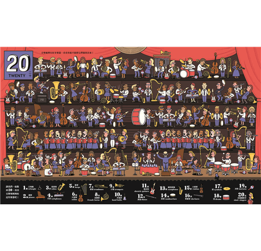 例如單元20,學習20種樂器後,每種樂器都可以進行重複的數數練習,直到找出20位合唱團歌手。數量有多少,就重複練習了幾次。