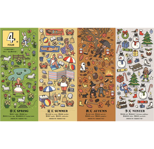 →數字4是描述四季的風景,可以搭配5的耶誕節、9的衣物、10的戶外野餐、12的城市單元,和孩子一起了解生活周遭環境。