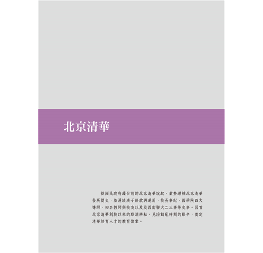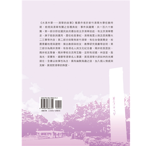 《水木清華——清華的故事》積累作者於新竹清華大學任教時期,梳理與清華有關之各種典故、事件與趣聞,共一百六十餘篇。第一部分即從國民政府遷台前北京清華說起,有北京清華簡史、庚子賠款與運用、歷任校長事紀、清華風雲人物及西南聯大二三事等內容;第二部分則聚焦新竹清華,有在台發展簡史、校園景觀地理與建物、傑出教師與校友、教學研究貢獻等說明;第三部分為兩岸清華,有各項名人與文化紀念會、兩岸校長面談、兩岸校友聚會、兩岸學術交流等互動,並附有胡適、林語堂、殷海光、梁實秋、錢穆等清華名人事蹟,展現清華大師如林的光輝過往。全書以故事性為主,偶有幽默風趣之語,加入個人情感與見解,展現對清華的熱愛。