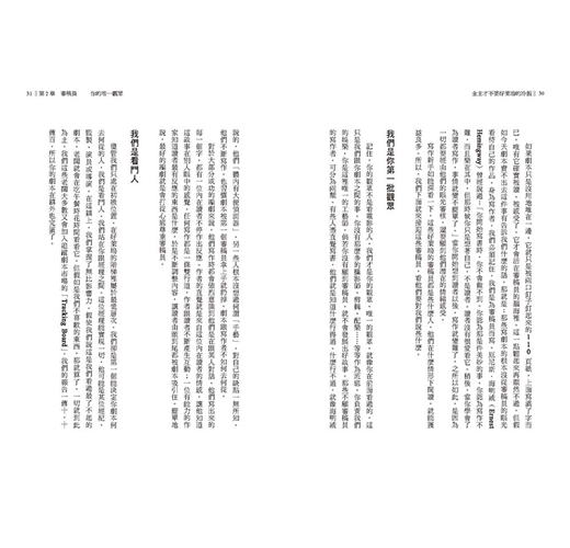其次是基於一個比較自私的理由。我做劇本創作的指導和顧問,早就忙死了,還要看爛劇本,這不折騰人嗎?所以我才想介紹專業編劇的技巧,讓生手能把寫作提升到令人滿意的程度。不是說會好到立刻能賣,但至少看得下去,也好讓人賞析。