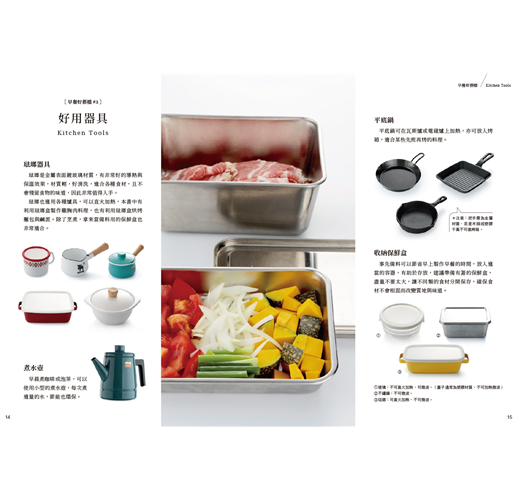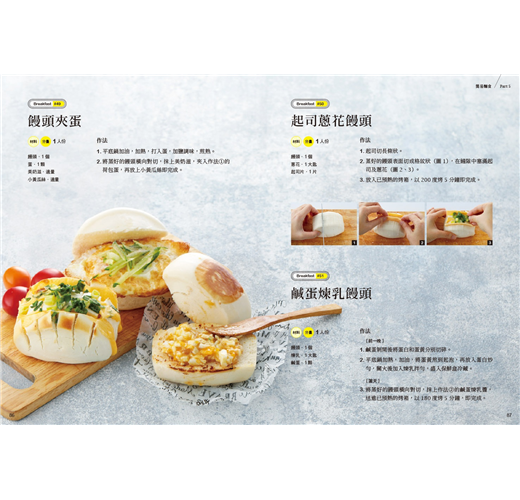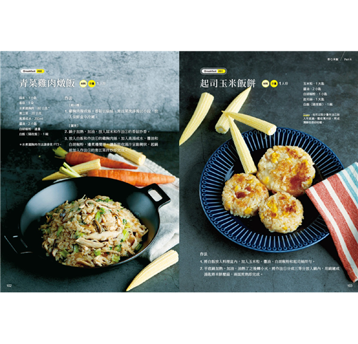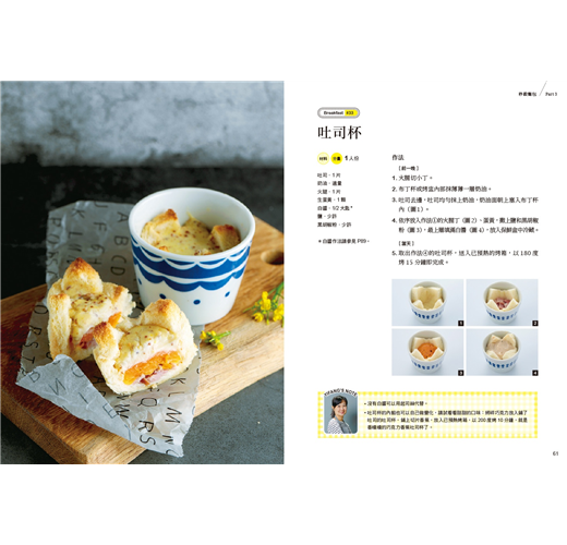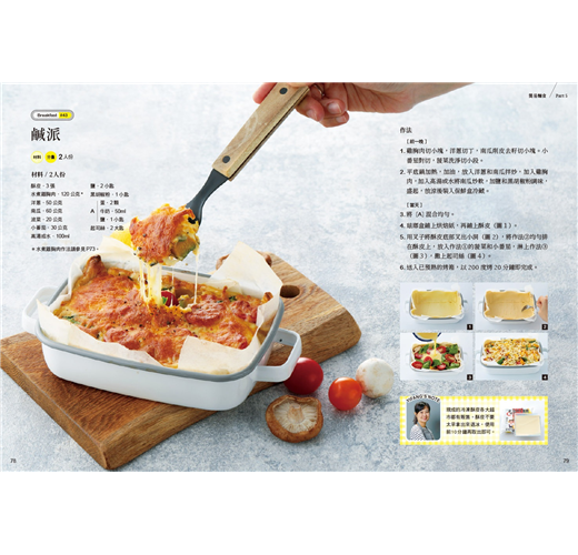 這本書裡想跟大家傳達的是,早餐可以很多元,早餐可以不設限,除了我們最常使用的吐司和麵包外,其實米飯和麵食也是很好的早餐選擇之一,加上各種豐富的蔬菜、肉類與水果,變化後可以做出數十種或是更多的早餐食譜。就像在教學時一樣,我都會跟學生說,不要將創意設限,不要讓廚藝受限,利用身邊常見的食材,做出屬於自己的餐點,早餐也是一樣。