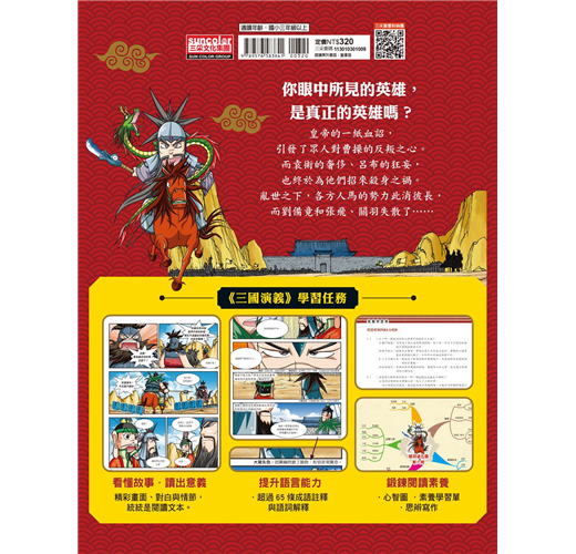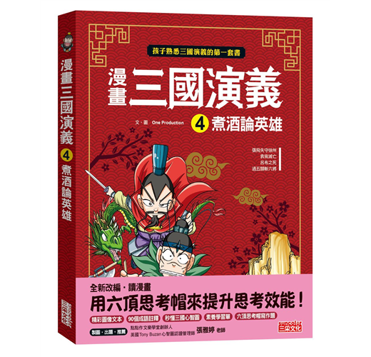 《三國演義》可說是東亞最傑出的歷史小說,也是跨越時代、流傳最廣、影響亞洲最深的暢銷名著。這套全新改編的漫畫,以誇張的人物設計、配合讀者的情節與對白,保留了「鬥智優於鬥力」的東方智慧,讓孩子們享受閱讀《三國演義》的樂趣,以作為孩子有一天閱讀原典的基石。除此之外,本書也延請「點點作文樂學堂創辦人英國Tony Buzan 心智圖認證管理師」張雅婷老師,特別以漫畫作為文本,撰寫【秒懂三國演義心智圖】,並編寫【閱讀理解PIRLS測驗題】與【六頂思考帽寫作法】。