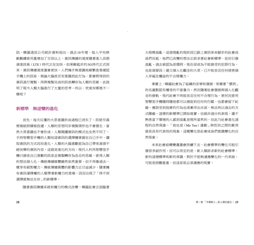 過去30年間,韓國老一輩為製造業所帶來的成就只能用「奇蹟」來形容,但創造此刻奇蹟的也只有「人」。在手機智人時代也是人最為重要,如果「人」是我們要的正確答案,那豈不是我們能做好的事嗎?製造業的精密程度已經發展到了世界的最高水準,再加上過去10年間以驚人的速度成長的資訊產業的爆發力,我們還能打造出令全球消費者為之瘋狂的新產業或新產品嗎?就至今的成果來看完全是有可能性的,可以把手機智人時代作為跳躍的契機,值得鼓起勇氣一搏,眾多數據都指出我們可以拋開恐懼並且邁向新時代。我想透過這本書和大家分享步向新世界的勇氣。