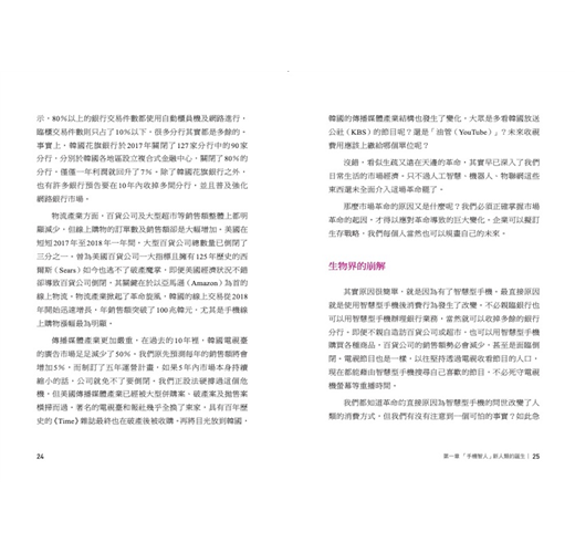 把本書獻給不停鼓勵我挑戰新世界的人生導師金永鎮教授,也誠心感謝崔宰川教授對我這不懂事的工程師灌輸以人為本看待世界的思維,也感謝創造三星電子奇蹟的「人的力量」讓我有深刻感悟的權五鉉會長,以及感謝親自向我揭示手機智人文明時代之企業樣貌的金峯鎮代表。對於幫助我建立手機智人時代觀點的點子設計師樸容厚,也深表感謝。如果沒有能讓我深切體會到世界變化的實物數據且給予我研究機會的各大韓國企業,本書便沒有機會出版。也在此向各位讀者朋友獻上我的感謝,持續分析新文明變化並與我共享資訊的各位朋友也都是本書的另一位作者和主角。