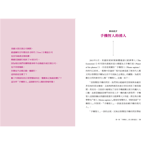 第二章詳細分析手機智人造成的市場變化,將媒體產業、流通產業、服務業、製造業等多類型產業的結構變化與手機智人的消費行為變化做連結整理。