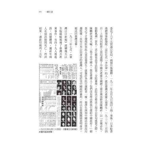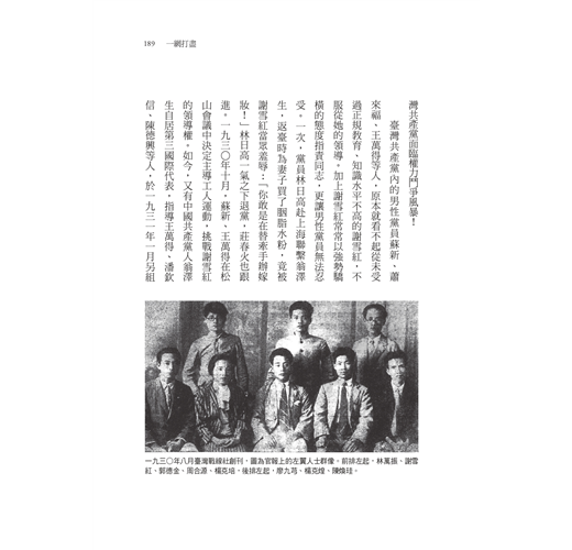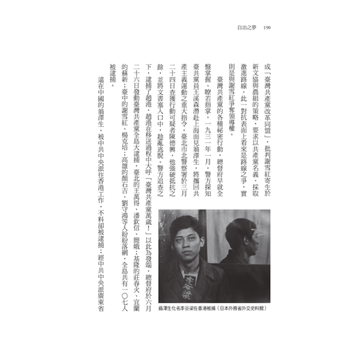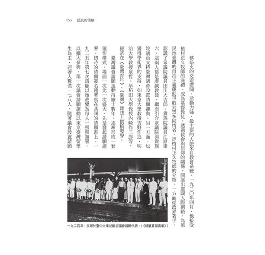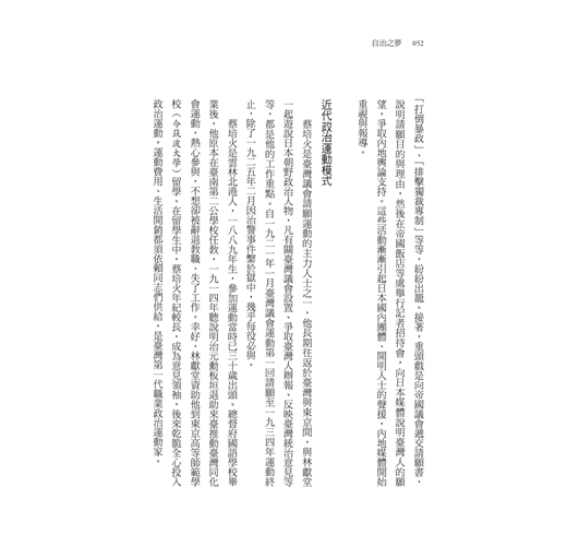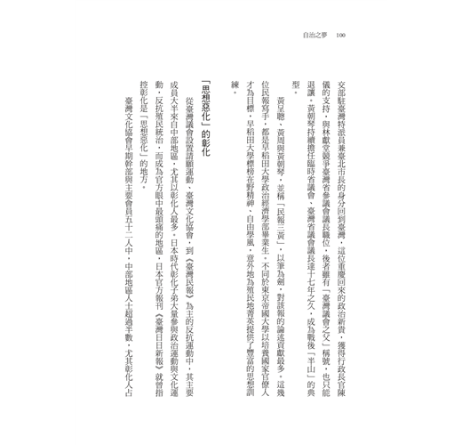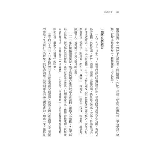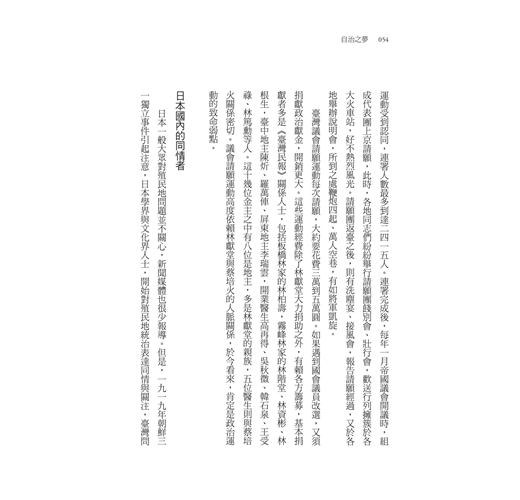 喊出「臺灣是臺灣人的臺灣」,追尋島國自治的夢想。在嚴酷高壓的時代,少數人不計個人利害,勇於挺身對抗。雖然這一波民主運動遭到重擊,並未能達成改造臺灣社會的目標,但前人的勇氣與努力,足以讓我們產生信心,不致悲觀喪志。日治時期的民主運動過程也提示我們,積極公共參與、為群體獻身是高貴的美德……這些為公共獻身的勇者,應該成為典範,被大眾所熟知,成為臺灣社會的共同記憶。