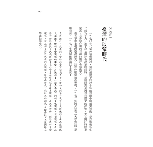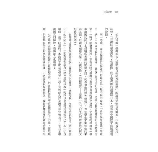這些年少時期的困惑,成為日後學術研究的動力。我十分慶幸自己生逢其時,一九八○年代末期臺灣歷經反對黨組成、解嚴與民主化,不需像先行者一樣付出血淚代價,就能享有自由思考探索的空間,能貼近自己生長的土地,梳理群體共同的過去,體會前人的憧憬、憤怒與哀愁。