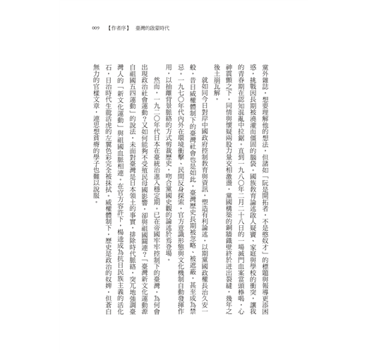 雖然內部有路線與理念之爭,外面有統治者的步步緊縮與壓制,後期更面臨了戰爭與東亞秩序變動的壓力,以及二次大戰後新統治者毫不容情的斲傷;然而,從一九二〇年到一九四七年,這近三十年的時光可說是臺灣的啟蒙時代,「臺灣人」意識在這段期間內形成,對於自由、民主、人權與自治等概念的理解,也逐漸根植人心而成為共同的追尋。