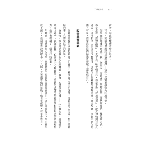 有些轉變則是來訪者主動發起的。他們對自己和生活或多或少有著不滿,不想再這樣繼續下去。他們想減肥、想運動、想控制自己的脾氣、想換個工作、想換種方式和家人相處、想開始或者結束一段關係⋯⋯總之,他們想要換種生活方式,重新...