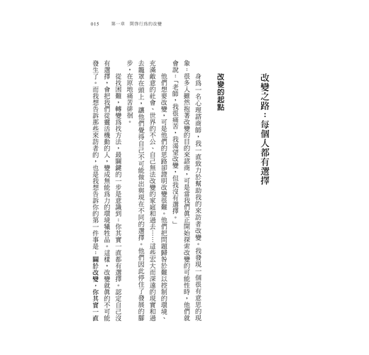 其實這正是我一直在做的事。從事諮商的那天起,我就經常思考,人們所面對的種種成長難題,有沒有共同的心理根源?當人們想要轉變時,阻礙他們的心理機制究竟是什麼。而我又能提供哪些幫助他們轉變的系統工具和方法?