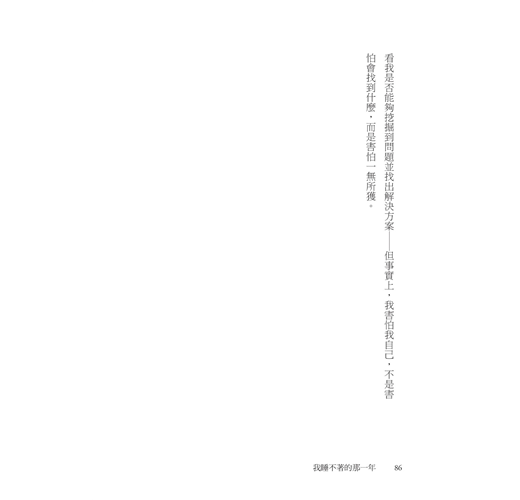 「我必須繼續做自己的考古學家,四處探尋,看看我是否能夠挖掘到問題並找出解決方案——但事實上,我害怕我自己,不是害怕會找到什麼,而是害怕一無所獲。」