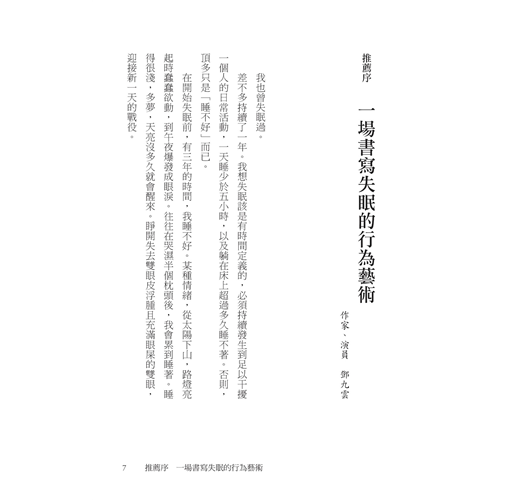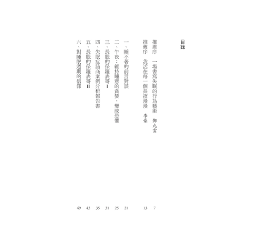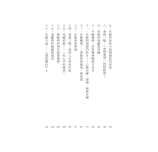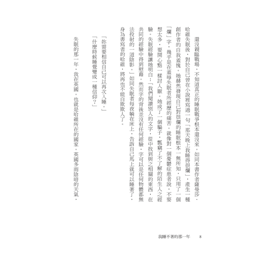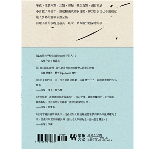 失眠是現代人的文明病—是焦慮、憂鬱、不安全感的副產品。除此之外,失眠還有許多潛在原因,例如,環境改變、懷孕、經前症候群、更年期等等……近來心理相關出版多聚焦在焦慮憂鬱等情緒紓緩、厭世療癒等指南式/經驗分享;而「睡不著真的非常痛苦,我也想要被救」、但也不能算是精神疾病的化外民無眠者,其實也很需要被救援。(尤其隔天還要繼續當上班族戰士、或是上課的莘莘學子,拍拍,真是辛苦了。)
