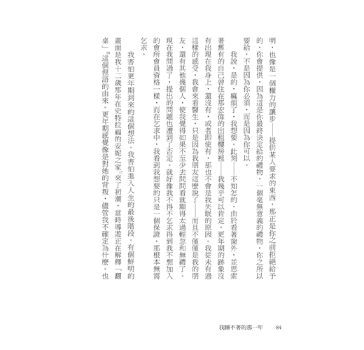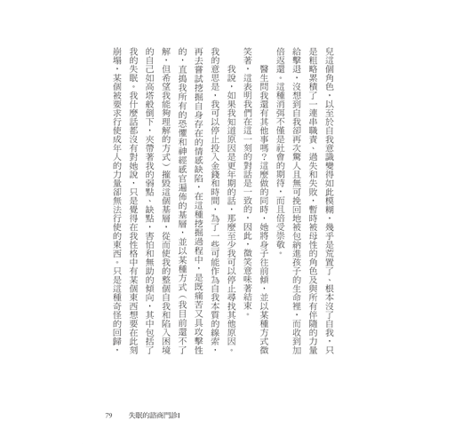 這是怎麼回事,要如此牢固確立在此時此刻。真是的。我們是,我是,混亂分散在時間裡,橫衝直撞。我可以在瞬間躍至三十七歲;我可以再次回到六歲,聽媽媽一邊唱歌,一邊擦拭她珍愛的枝狀燭臺,那燭臺使她想起她沒能擁有的生活。現在我可以閃避到自身另一個可能的版本,一個能做出不同的,更好的決定的人。我可以把整個生命都投注在「如果」這個擺盪的樞紐上。我的人生是何時,直到,昨天,明天,一分鐘前,明年,然後,再次,永遠,以及從不。