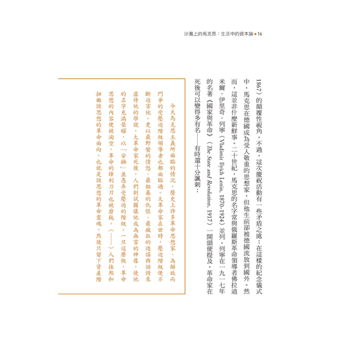 馬克思變得與其他思想家無異嗎?不同的年代裡,有許多人因應當時的社經局勢而提出「重返馬克思」的想法。榮克的確不害怕《資本論》(DasKapital, 1867)的顛覆性視角。不過,這次慶祝活動有一些矛盾之處:在這樣的紀念儀式中,馬克思在德國成為受人敬重的思想家,但他生前卻被德國流放到國外。然而,這並非什麼新鮮事。二十世紀,馬克思的名字常與俄羅斯革命領導者佛拉迪米爾.伊里奇.列寧(Vladimir Ilyich Lenin, 1870~1924)並列。列寧在一九一七年的名著《國家與革命》(The State andRevolution, 1917)一開頭便提及,革命家在死後可以變得多有名─有時還十分諷刺: