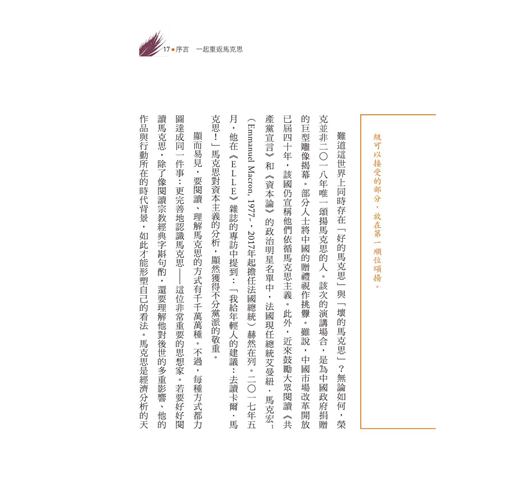 難道這世界上同時存在「好的馬克思」與「壞的馬克思」?無論如何,榮克並非二○一八年唯一頌揚馬克思的人。該次的演講場合,是為中國政府捐贈的巨型雕像揭幕。部分人士將中國的贈禮視作挑釁。雖說,中國市場改革開放已屆四十年,該國仍宣稱他們依循馬克思主義。此外,近來鼓勵大眾閱讀《共產黨宣言》和《資本論》的政治明星名單中,法國現任總統艾曼紐.馬克宏(Emmanuel Macron, 1977~,2017年起擔任法國總統)赫然在列。二○一七年五月,他在《ELLE》雜誌的專訪中提到:「我給年輕人的建議:去讀卡爾.馬克思!」馬克思對資本主義的分析,顯然獲得不分黨派的敬重。