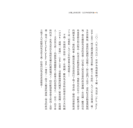 二○一八年五月五日,世界各地都舉辦了卡爾.馬克思(Karl Marx, 1818~1883)兩百歲冥誕的紀念活動。跟五十年前的一九六八年五月學運一樣,全世界興起一波波的抗議和大型罷工。對左派鬥士而言,這些紀念活動毫無疑問地,都在慶祝馬克思的思想,以及後人對其思想的政治實踐。在法國,雖然仍有些重要節目和出版品,但這次活動卻特別低調,規模也比以往小,而歐洲大部分的國家也有一樣的現象。難道是馬克思退流行了嗎?或者說,變得沒那麼叛逆了?這一切都和一九六八年的景象大相逕庭……