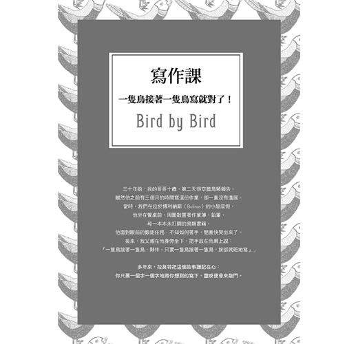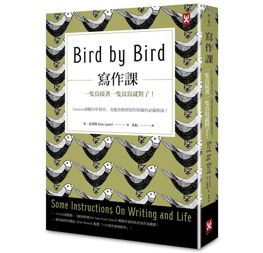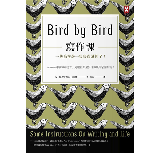 「三十年前,我的哥哥十歲,第二天得交一篇鳥類報告。雖然他之前有三個月的時間寫這份作業,卻一直沒有進展。當時他坐在餐桌前,周圍散置著作業簿、鉛筆和一本本未打開的鳥類書籍。面對眼前的艱鉅任務,他不知如何著手,簡直快哭出來了。後來身為作家的父親在他身旁坐下,把手放在他肩上說,『一隻鳥接著一隻鳥,夥伴。只要一隻鳥接著一隻鳥,按部就班地寫。』」