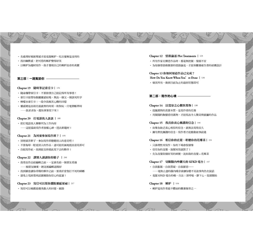 安.拉莫特是現今美國最具影響力的寫作導師,在本書中,她道出了所有出色的寫作指南都沒提到的關鍵要點,並針對4大創作面向:「技巧」、「心理」、「日常」、「出版」,給予最私房的經驗傳承。不管你寫的是小說、報導、評論,還是文案,她都能讓你寫得更加自然流暢,且深刻動人!而且,寫作本身已經夠孤獨、折磨人了,所以你更需要這位極具幽默感的老師!