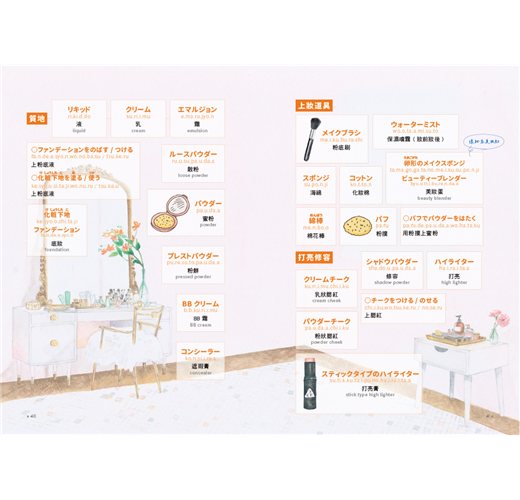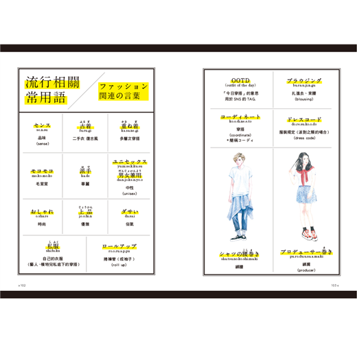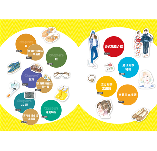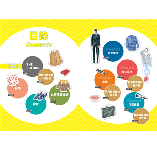 在日語當中,流行物品名稱一般多以外來語表示,取自英語、德語、法語……等,有時也簡略使用,本書特別在外來語的部分標示出原文,方便讀者對照學習。並將雜誌內常出現的流行服飾、美容保養用品、飾品、鞋類、配件、以及美髮沙龍等等品項分門別類,搭配上精美的插圖,以日語、外來語原文、中文、羅馬拼音一同表示,將這些流行物品的風貌完整呈現出來,帶您透過紙上逛街購物的方式,一網打盡所有流行日語單字。除此之外,本書將SHOPPING會話編入其中,希望讀者除了認識流行字彙之外,也能學到基礎日語會話,甚至到日本購物,都能正確地告訴店員所需要的商品唷。