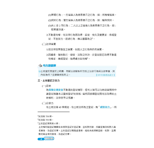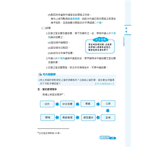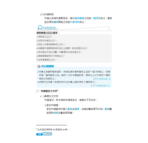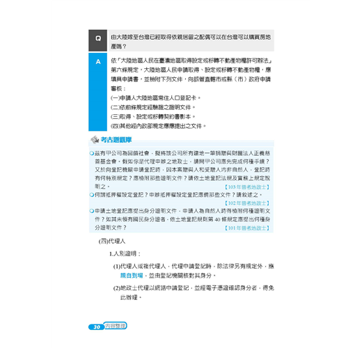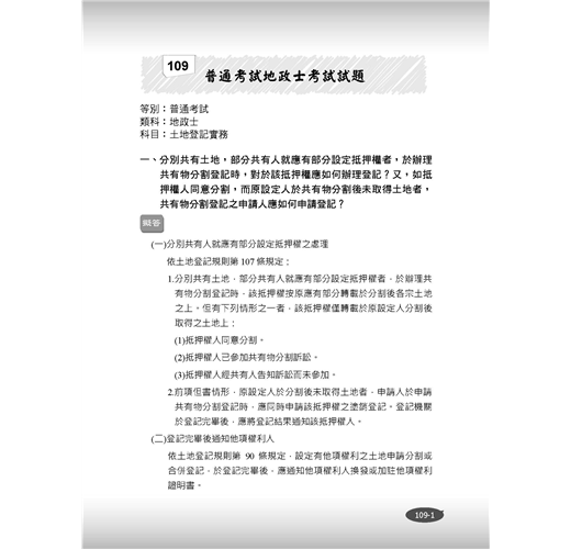 ★將歷屆試題穿插於內文對應段落,凸顯重要考點!★收錄最新95~109年地政士歷屆試題,100%題題解析!★2020年最新修正法條收錄!【常見問答】Q:本書內有包含題庫嗎?A:本書除了重點整理以外,還包含95~109年地政士試題共15份,題題詳解。Q:請問本書是最新的法規嗎?A:本書收錄至出版日前之最新法規。【本書適用】這本《土地登記實務》適用於專門職業及技術人員普通考試地政士考試。【考試簡介】地政士考試不限科系,只要高中(職)畢業即可報考,採及格制度沒有錄取人數限制,只要總成績達60分就合格。加上「實價登錄」實施後,地政士地位提升,收費行情每件約15,000~24,000元,月入可高達20萬元!且考試科目與不動產經紀人考科重疊性高,同時取得,業界最吃香!【本書優勢】.對土地登記太多的技術性規定感到苦惱嗎?.沒有實務經驗搞得定〈土地登記實務〉這科嗎?.申論題要怎麼破題及清晰論述,才能獲得閱卷老師青睞?土地登記實務著重於實際操作的經驗,因此想讀好本科,要先從登記當事人以及登記機關的角度出發,本書作者透過內容整理引導,輔以歷屆試題演練的方式,將為您解開疑惑,消除疑慮,順利於考試時取得高分!一、淺顯易懂土地登記實務的內容多涉及實際操作,對於欠缺相關實務經驗的考生而言,最需要一本從實務切入的參考書籍。因此本書整理相關實務重點以及常考規定,將不必要、繁雜的資訊去除,只留下會考的、能考的及必考的重點,讓讀者快速抓取重點,不只會看熱鬧,更會看門道。二、綱舉目張作者藉由歷年試題判斷常考重點,透過總論、各論分類編寫,架構清楚分明,讓讀者研讀時能夠清楚知道章節脈絡,以及各章節間的關係,且將重要實務見解與歷年試題穿插內文相對應位置,讓土地登記實務內容不再是斷簡殘篇的各種法規,而是透過本書進行體系性地學習。再搭配本社出版的《地政士不動產實用小法典》,讀者可立即知悉被頻繁命題的考點,將記憶力花在刀口上。三、凸顯關鍵本書採雙色印刷,答題關鍵字以藍色標記,利用黑白藍三種色調,使用圖表整理繁雜內文,進行系統性學習。多一種顏色,多一道區隔,就是要使土地法規之體系在讀者腦海中清晰建構。四、題題詳解本書收錄95~109年普通考試地政士考試試題共15份,題題詳解。上考場作答時,最怕申論題論述雜亂無章,無法清楚表達自己腦中的解題思路。本書之申論題擬答,論述考點具層次感,教讀者如何鋪陳解題內容吸引閱卷老師青睞,做到解題思路行雲流水,不絕於卷上。【本次改版修法重點】本書收錄至出版日前之最新法規,改版修法重點包括:土地登記規則(108.12.09)現行實務上,有部分祭祀公業或神明會因故未能檢附權利書狀,致無法完成更名登記為法人所有,不利該類團體土地之後續管理利用,與維護並延續該類團體其固有傳統特性之政策目的有違。為利相關土地清理,並達土地利用及管理目的,及因應簡政便民措施推動,修正要點如下:一、為利祭祀公業與神明會土地之清理,增列依祭祀公業條例第50條或地籍清理條例第24條規定申請更名登記得免附權利書狀之規定,一併配合修正未提出權利書狀登記完畢後應公告註銷之情形。二、為因應簡政便民措施推動與法規鬆綁,新增由中央地政機關公告免予提出權利書狀之規定,以利實務執行。【三民考生上榜心得1】地政士上榜生:林家宇國文:51分民法概要與信託法概要:71分土地法規:64分土地稅法規:95分土地登記實務:72分我是非本科系考生,大學時選修不動產相關科系的課程接觸到地政士這個職業,因而在畢業後進事務所任職助理的工作。 因為在這個行業不會對助理有一輩子的職涯規劃,也想取得證照來增加客戶對我的信任,因此有非考上不可的壓力。分享各科準備方法:【民法概要與信託法概要】我認為民法不會是最難準備的一科,雖然法條多範圍廣,但綜觀歷屆地政士考試的出題方向可得知,總則/債編/物權編(混合出題2~2.5題)、親屬繼承編(完整的1題)、信託法(0.5~1題),信託法需全背,親繼範圍較少有出題方向需明確掌握,以上就有1.5題的分數了,再配合總則/債編/物權編以重點式的方向詳讀大考點的部分,其實基本分就不會太差,若此科有拿到45~50分再用其他三科cover已經足夠了。【土地法規】土地法規法條複雜,多為疊床架構式,光是一個區段徵收就在三個法條裡有不一樣的規定,可以搭配圖表的方式重點整理,再詳細列出差異點加強記憶,土地法及地政士法考點少較好把握,另外需注意土地登記規則的題目也會在本科中出現。(一)找出考點土地法:外國人禁止取得、土地法第34-1條、無人繼承處理、優先購買權。平均地權條例:照價收買、市地重劃、出租耕地收回。土地徵收條例:協議價購、徵收補償、收回權、撤銷廢止徵收。(二)善用比較法抵價地vs抵費地(給付標的、計算方式、總面積比例、稅負、強制性。)(三)名詞解釋ex市地重劃、土地徵收、區段徵收的定義,要怎麼用流暢的方式表達出來,通常可以做為破題用。(四)大法官解釋ex#579、#652、#731、#739戴老師的民法、土地法課程都會補充大法官解釋的部分,若有餘力一定要好好把握,並能理解及略記大法官解釋的內容在答題時作補充。【土地登記實務】雖然範圍較小,但沒有實務經驗較難消化一些艱澀的用字及內容,以考科來說雖然是實務,但歷屆試題大多還是著重在法條的背誦。老師上課時會