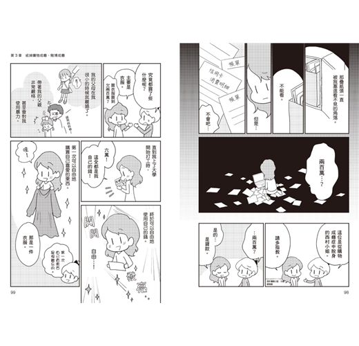 「用簡單易懂的漫畫來呈現深入且專業的內容,非常成功!成癮的種子就潛伏在每個人的腦中,需要盡早自我察覺!我透過本書讓原先在成癮水窪(輕度成癮)中的自己,成功擺脫購物成癮,而不至於陷入成癮泥沼(成癮症)中!」