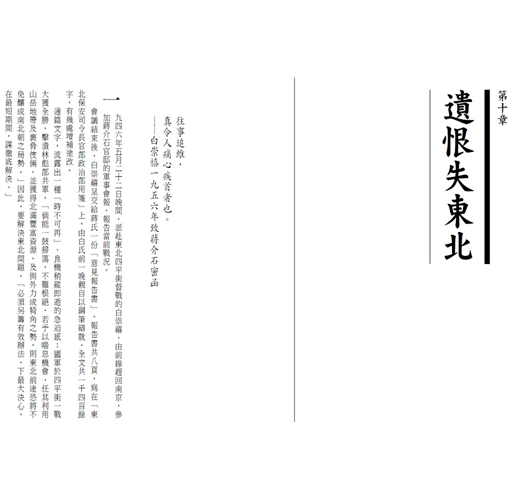 中冊〈國共內戰〉從1946年國共東北之爭說起。這場「失去的勝利」,令蔣、白兩人晚年頓首跌足、嗟嘆不已。白崇禧擔任國防部長,是蔣肯定白的才幹,然而卻不讓其參與作戰決策,白以部長出陣大別山,對戰劉伯承、鄧小平。其後白崇禧助桂系李宗仁當選副總統,擊敗孫科,蔣白關係發生重大改變。蔣免去白國防部長,命其轉任華中剿總,襄樊保衛戰後白對蔣越級干涉指揮公開批評,徐蚌會戰兩人戰略看法分歧,白拒絕指揮,蔣將戰敗之因諉過於白拒絕領兵營救。國軍連番失利,民心動搖,白連發蔣「亥敬」、「亥全」電報,敦促向美尋求調停,一番以國為重的慷慨陳詞,被蔣解讀為桂系陰謀奪權,蔣白關係已無可彌補。林彪百萬大軍破關南下,白崇禧回戈一擊,在青樹坪大破四野,但西南保衛戰損失慘重,廣西雄軍覆滅,白崇禧毅然赴台,與中華民國共患難。