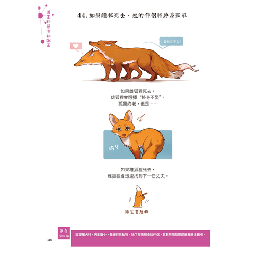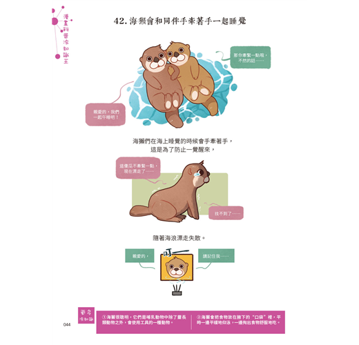 ◎母貓往往喜歡用右爪,公貓通常是左撇子、長頸鹿寶寶會上“幼兒園”,負責管理幼兒園的園長還每天都輪班、海獺會和同伴手牽著手一起睡覺,說穿了是為了避免失散、無尾熊為什麼總是愛抱樹,每次到動物園看到都這樣、松鼠因為記性不好,所以每年種下幾百棵樹、海豚不僅有自己的語言也有自己的名字…