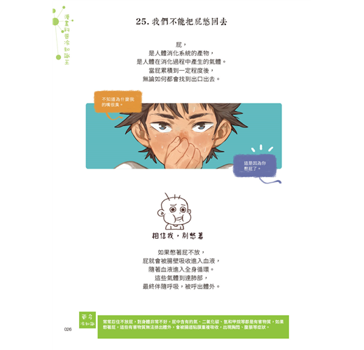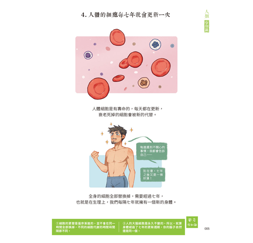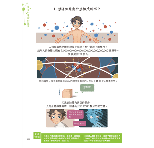 ◎人是會發光的生物,所以請記住你會發光、人類和黑猩猩的基因相似度達96%,但也有50%與香蕉相同、我們不能把屁憋回去,相信我,那可能會憋出問題、我們永遠想不起夢境的開頭,每個夢好像都是從故事中間開始的、人的眼淚是一種特殊的藥,又能殺菌又能…
