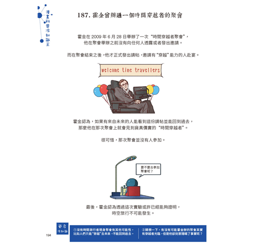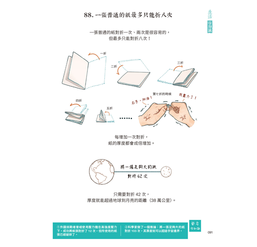 ◎覺得糖水不夠甜,加一點鹽就會更甜、雞蛋要倒立著放更能保鮮、原來鈔票也有直式的、打火機比火柴更早被發明出來、一張普通的紙最多只能對折8次、麵包可以吃,竟然還可以當橡皮擦來用…