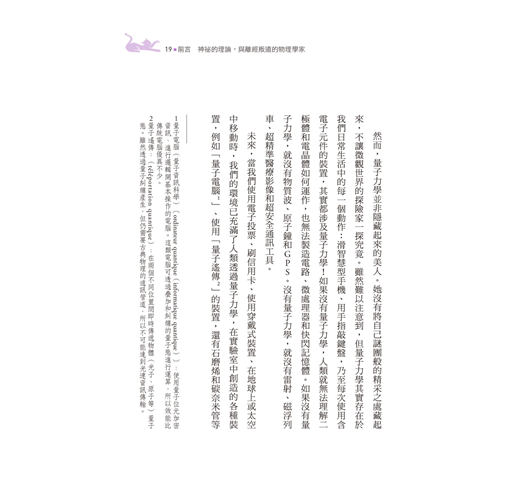 然而,量子力學並非一位隱藏自己的美人。她並沒有將自己謎團般的精采之處隱藏起來,不讓微觀世界的探險家一探究竟。雖然難以注意到,但量子力學其實存在於我們日常生活中的每一個動作:滑智慧型手機、用手指敲鍵盤,乃至每次使用含電子元件的裝置,其實都涉及量子力學!因為,如果沒有量子力學,人類就無法理解二極體和電晶體如何運作,因而也無法製造電路、微處理器和快閃記憶體。如果沒有量子力學,就沒有物質波、原子鐘和GPS。沒有量子力學,就沒有雷射、磁浮列車、超精準醫療影像和超安全通訊工具。