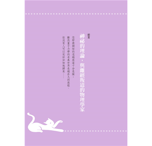 在量子力學的世界中,神秘的貓可以維持半死半活、狡猾的老鼠只需看一眼月亮就能讓月亮存在、特定的作用可以在時間與空間之外進行、物體可以同時存在於兩個位置,還能從一個位置瞬間前往另一個位置,不需經過任何中介地點……在這個世界中,萬物都只是機率和想像中的波動、物質只不過是不斷重新創造的短暫振動、所謂「真空」充滿著大量能量、無限小的量和無限大糾結在一起、平行世界因...