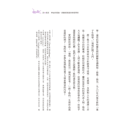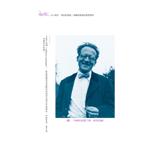 在所有量子力學的重要探險家和學者之中,有誰比埃爾溫.薛丁格(Erwin Schrödinger,1887-1961)更適合當這趟旅程的導遊呢?他的名氣或許不如普朗克、愛因斯坦、費曼;前瞻性的視野或許不如波耳、德布羅意、包立;也並未和狄拉克、馮紐曼和海森堡等人一同名列量子力學的早期先驅(別擔心,如果沒聽過這些名字,這本書正是為您量身訂做!)但是薛丁格的一生和其著作,正象徵著量子力學的發展。