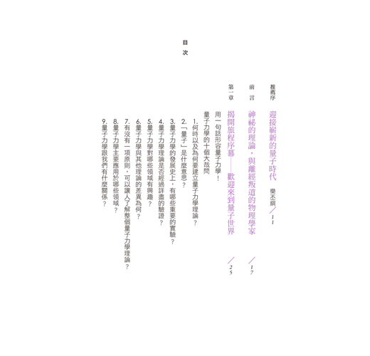 的確,就如美國物理學家萬伯格(Steven Weinberg,1933-)所說:「從發現量子力學的那天起,人類便不再是相同的人類了。」這本書邀請您參與的旅程,超乎尋常。