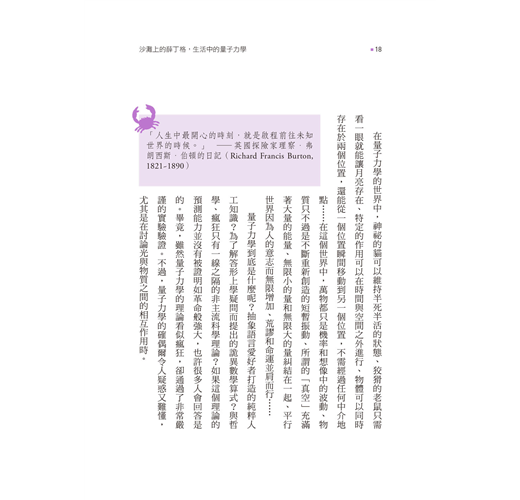 阿根廷詩人豪爾赫•路易斯•波赫士(Jorge Luis Borges, 1899~1986)曾說:「人類不需要建造迷宮,畢竟宇宙本身就是迷宮」。本書的第一章就是你在量子力學之旅中的指南、航海日誌、同時也是邀請函,為你引介後面即將出現的詳細量子力學概念和原理。