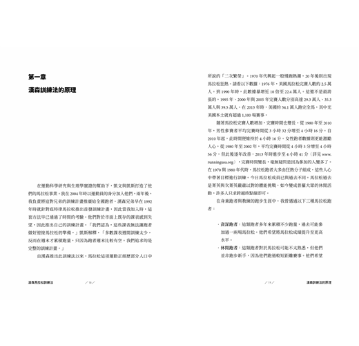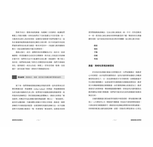 對於每一個單獨訓練課表的用意與操作方式,漢森也做了很清楚的說明,速度跑、強化跑、節奏跑、長跑,仔細閱讀一遍,特別是那些特別提醒的執行要點,一個好的訓練如果沒有掌握箇中關鍵,那很可能適得其反、徒增疲勞;對於市民跑者安排課表上常會碰到需要調整或更動的問題,漢森提供了幾種不同類型的範例與方案,讓我們保有訓練和生活取捨的彈性,這個部分在第五章有詳細的討論。