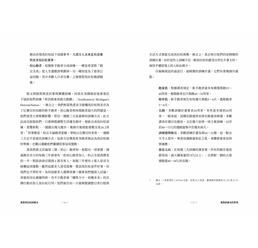 第六章關於如何選擇比賽目標的內容,有助於你在開始訓練前能先實際客觀地評估自己當下的體能狀態與可訓練時間,進而擬出一個可行又不至於沒挑戰性的合理目標。