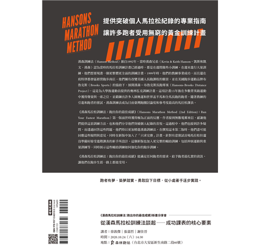 如果你是一位認真自我訓練的跑者,對《漢森馬拉松訓練法》想必並不陌生,有別於早年幾本馬拉松訓練的經典著作,如Running to The Top(Arthur Lydiard)、Daniels' Running Fomula(Jack Daniels)、Lore of Running(Tim Noakes)等,由菁英跑者盧克.漢弗萊(Luke Humphrey)彙集漢森兄弟的實務經驗與個人運動科學碩士的專業背景所撰寫的《漢森馬拉松訓練法》以更淺顯易懂、容易操作的方式將馬拉松訓練的觀念與其背後生理知識傳遞給大眾,特別的是,不論你是跑步新手,亦或資深老馬,漢森以馬拉松訓練最重要的核心概念—有氧體能—為出發...