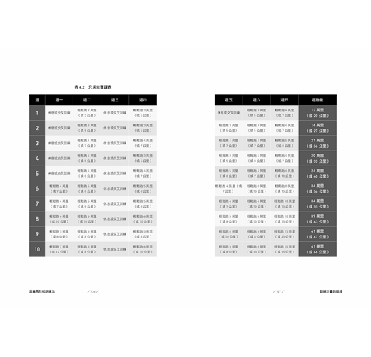 要有好的體能表現,光訓練是不夠的,恢復才是讓你進步的起始點,我建議你看完訓練計畫後可以先閱覽第九章關於恢復以及第八章營養和水分補充的相關內容,這些都有助於提升你的訓練品質並維持健康。