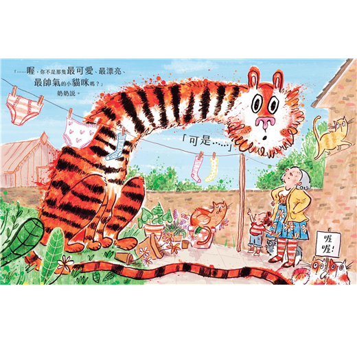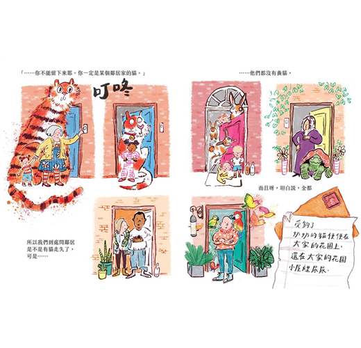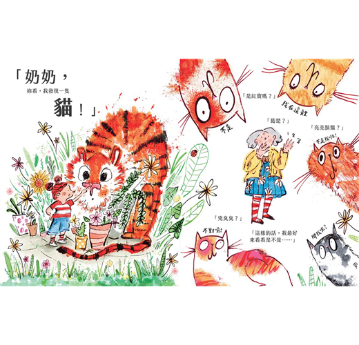★奔放畫風,故事幽默全書插圖色彩鮮豔、線條活潑,充滿動感與奔放的生命力。看似雜亂的畫面之中隱藏許多細節,各種貓咪元素無所不在。角色情緒充滿張力,誇張滑稽的故事情節及戲劇性的發展,幽默逗趣又高潮迭起。